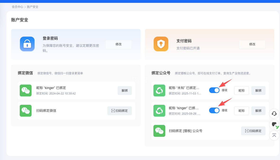 第6步、每个猎板账号支持最多邦定5个微信号,您可以自由设置通过哪些微信接受推送消息。