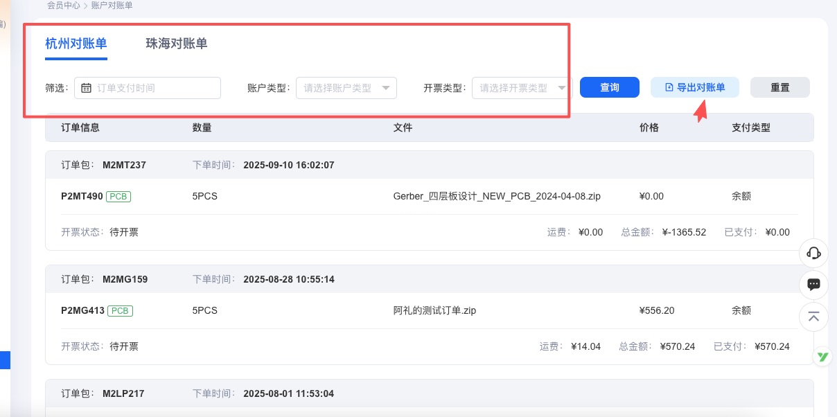 二、允许对订单发生时间、账户类型、开票类型进行筛选,筛选后点击导出对账单即可将符合条件的订单数据下载到本地!