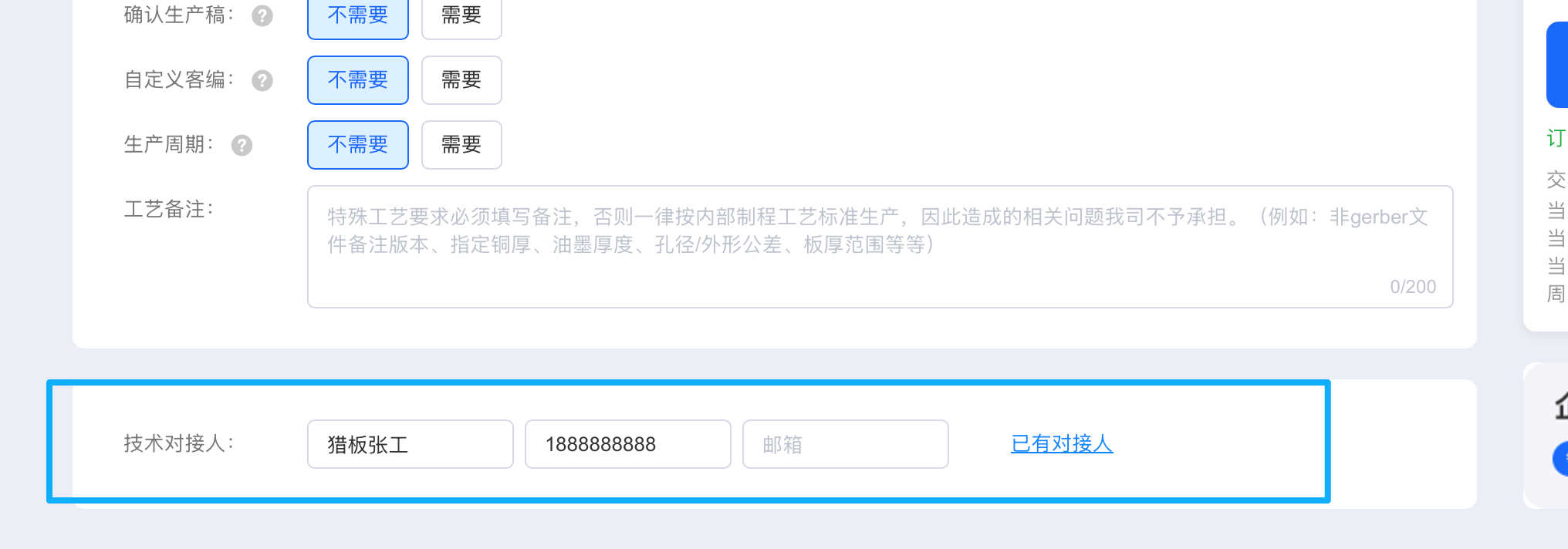 选择输入技术对接人后,我们在生产过程中出现的工程制造等问题,猎板客服会优先联系“技术对接人”!