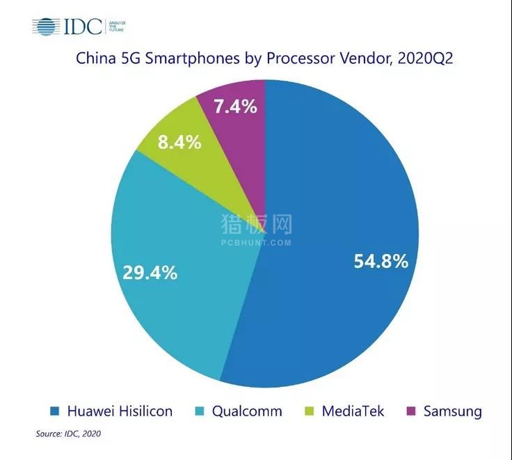 全球专业市场调查机构国际数据公司(IDC)近期公布的市场数据显示,在2020年第二季度中国5G手机市场各芯片平台的竞争中,华为海思依旧占据超过半数市场份额,高通居第二,之后是联发科和三星。