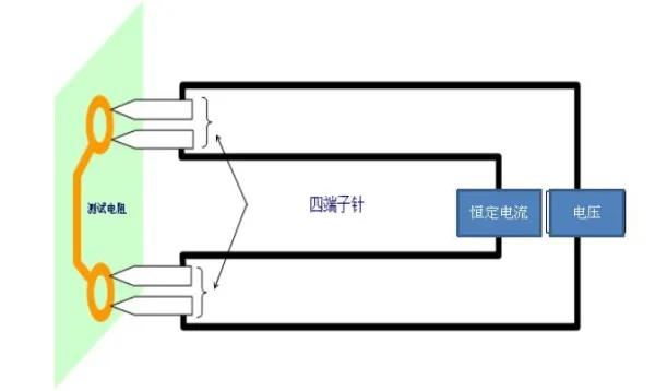 四线四端子测试通过每个测试点上扎2个针,使得测试电流与测试出的电压相互不产生影响,可准确测量被测电阻:R=U/I。