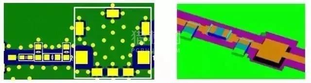 当50欧细微带线上有大焊盘时,大焊盘相当于分布电容,破坏了微带线的特性阻抗连续性??梢酝辈扇×街址椒ǜ纳疲菏紫冉⒋呓橹时浜?,其次将焊盘下方的地平面挖空,都能减小焊盘的分布电容。如下图。